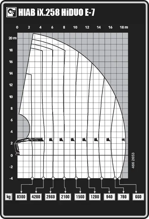 9600 kg @ 4.7m / 1380 kg @ 21.7m (HIAB X-HiPRO 548 E-9)