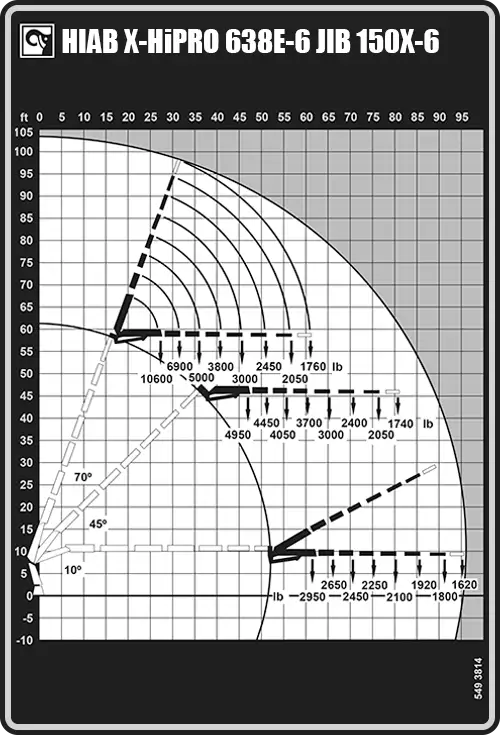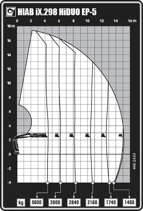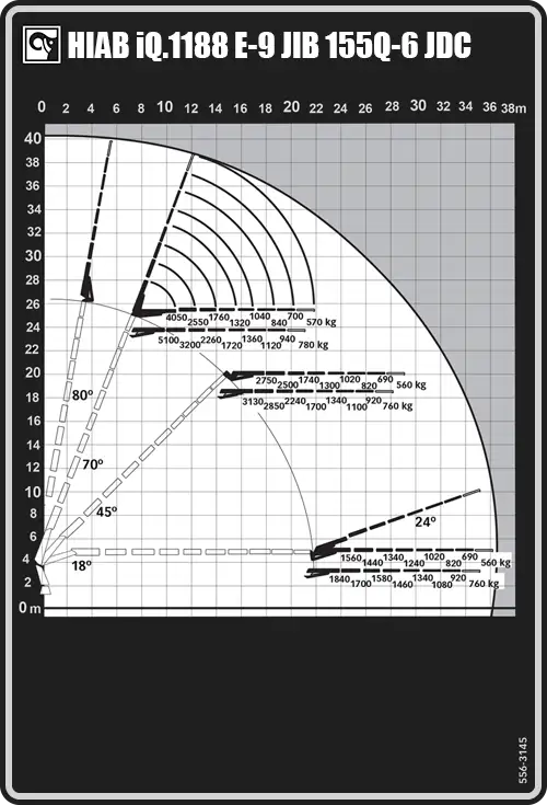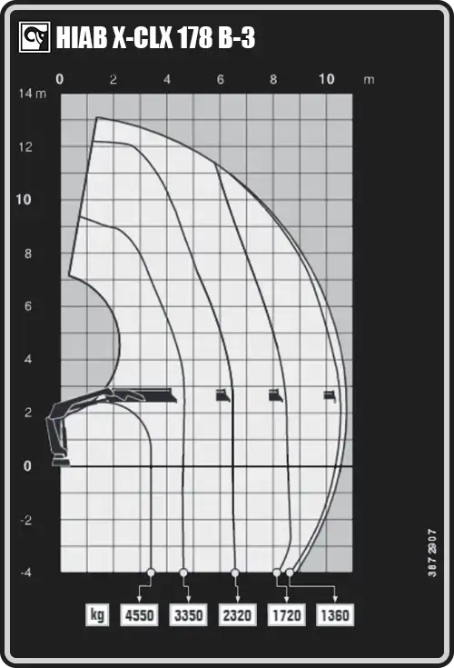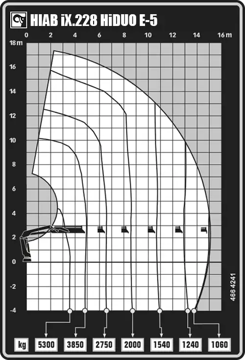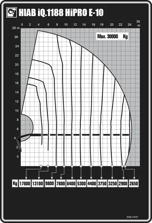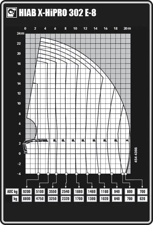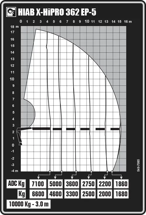 440 kg @ 22.7m / 230 kg @ 31.6m (HIAB X-HiPRO 548 E-8 + JIB 150X-6 JDC)Maximum Hydraulic Outreach