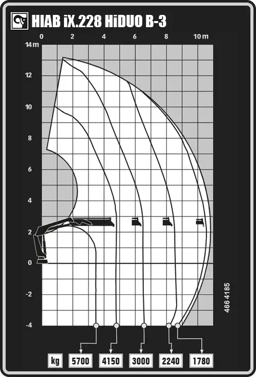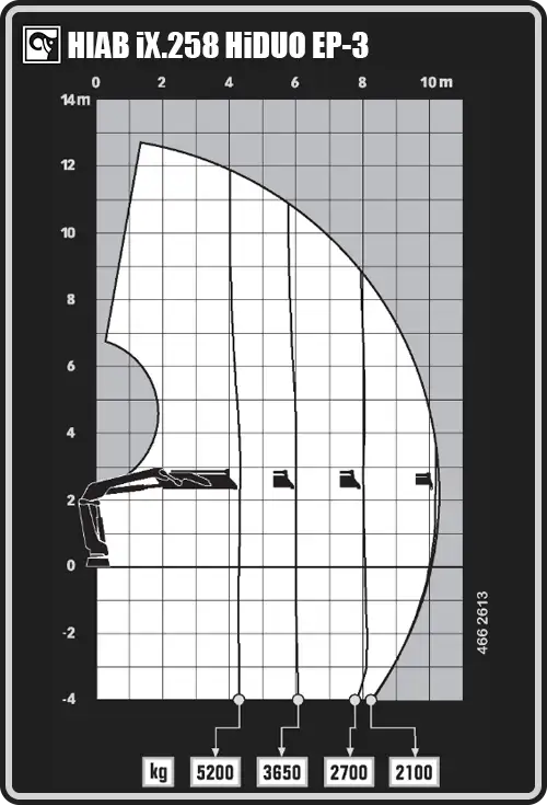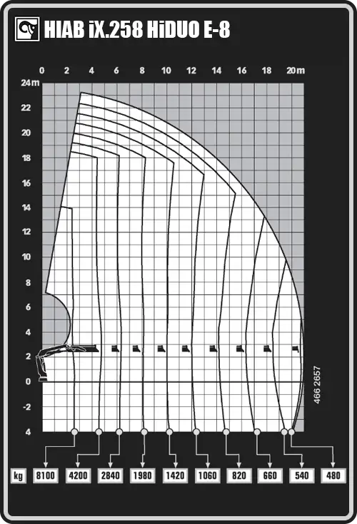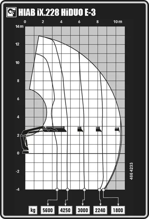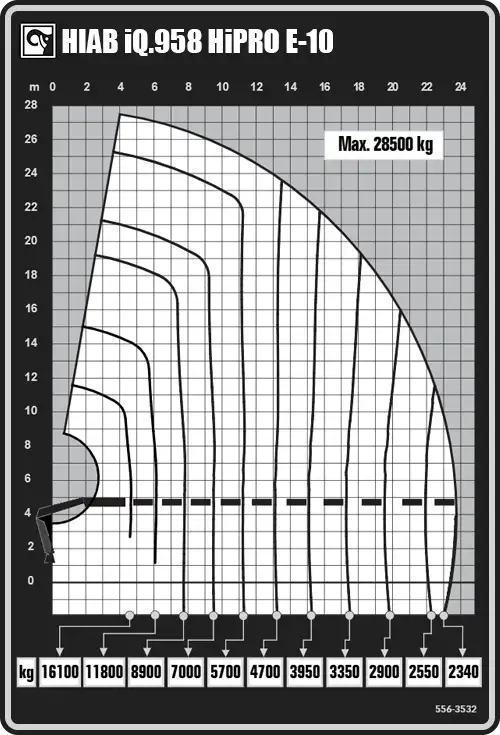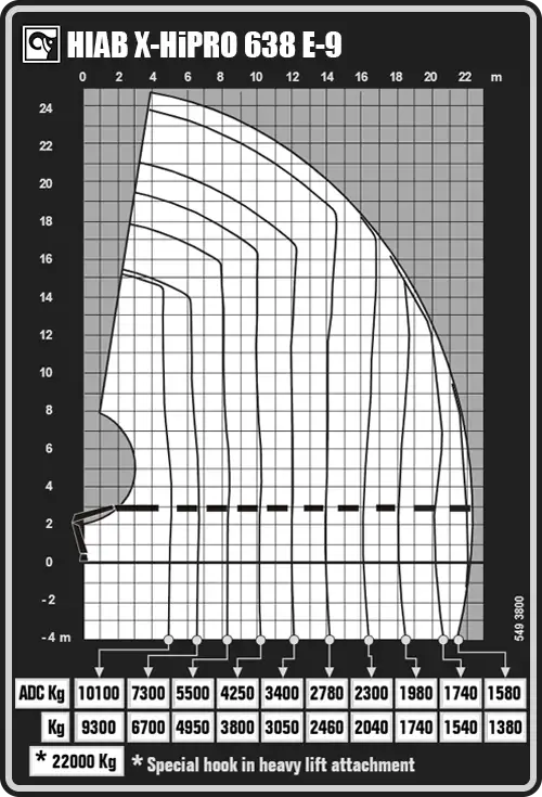 9600 kg @ 4.7m / 1380 kg @ 21.7m (HIAB X-HiPRO 548 E-9)