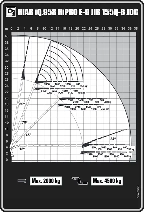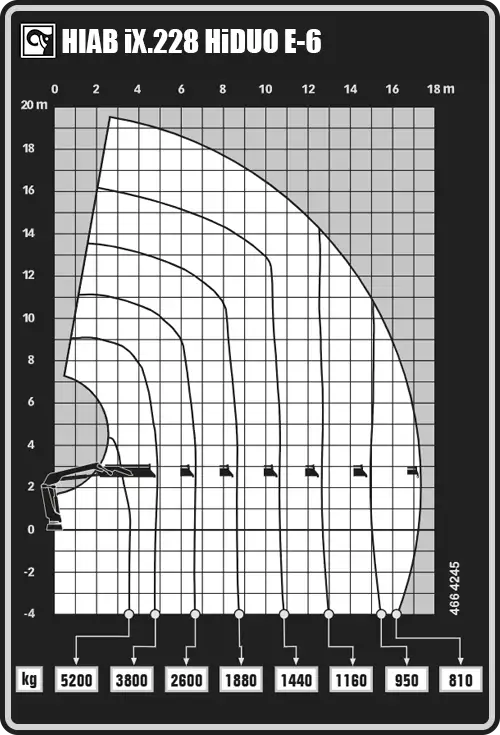 18,000 kg @ 3.6 m / 2,040 kg @ 23.8 mMaximum Hydraulic Outreach
